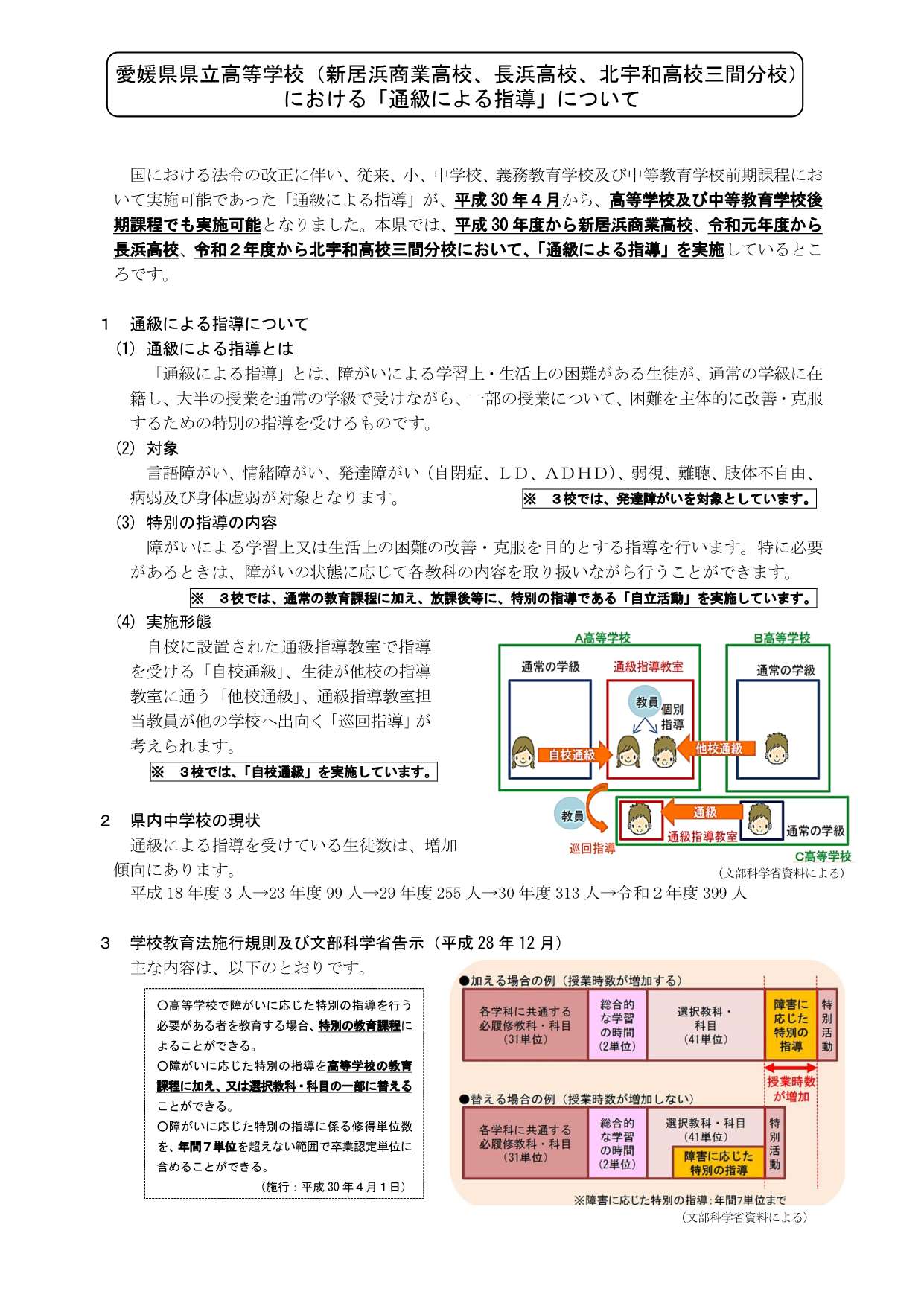 愛媛県県立高等学校(新居浜商業高校、長浜高校、北宇和高校三間分校) における「通級による指導」について(愛媛県教育委員会HPより)